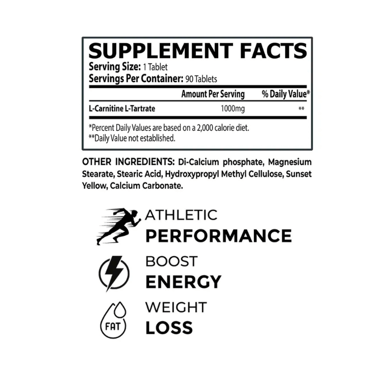 Supplement Facts (Per Tablet): 1000mg L-Carnitine Tartrate. No fillers, sugars, or artificial additives.